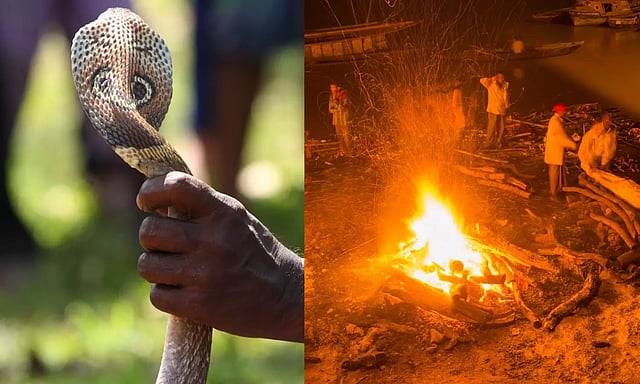 பாம்பு கடியால் உயிரிழந்த இளைஞரின் உடலை எரித்த சிதையில் கடித்த பாம்பையும் கிராம மக்கள் உயிருடன் உள்ளே வீசிய சம்பவம் நிகழ்ந்துள்ளது. சத்தீஸ்கர் மாநிலம் கோர்பா [Korba] மாவட்டத்திலுள்ள உள்ள பைகாமர்[Baigamar] கிராமத்தில் கடந்த சனிக்கிழமை இரவு திகேஸ்வர் ரதியா என்ற 22 வயது இளைஞனை அவர் வீட்டில் படுக்கையில் நுழைந்த விஷப் பாம்பு கடித்துள்ளது.