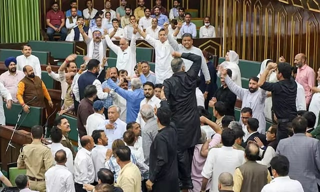 இதையடுத்து தேசிய மாநாடு மற்றும் மக்கள் ஜனநாயக கட்சி எம்.எல்.ஏ.க்கள் சட்டசபையில் கடும் அமளியில் ஈடுபட்டனர். ஒருவருக்கொருவர் வாக்குவாதத்தில் ஈடுபட்டனர். சபாநாயகர் இருக்கையை சூழ்ந்து கொண்டு கோஷங்கள் எழுப்பினார்கள். சபாநாயகருக்கு எதிராக நம்பிக்கை இல்லா தீர்மானம் கொண்டு வர வேண்டும் என வலியுறுத்தப்பட்டது.