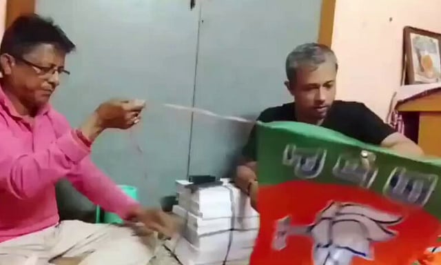மேற்கு வங்கத்தில் தேர்தல் பணிக்காக நியமிக்கப்பட்ட அதிகாரி ஒருவர் பாஜகவின் கொடிகள் மற்றும் துண்டுப் பிரசுரங்களைச் சீர் செய்யும் வீடியோ சமூக வலைதளங்களில் பரவி வருகிறது.