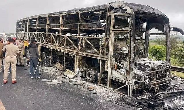 ஐதராபாத்தில் இருந்து பெங்களூருவுக்கு சென்ற ஆம்னி பஸ் நேற்று காலை ஆந்திர மாநிலம் கர்னூல் அருகே பைக் மீது மோதி தீப்பிடித்தது.