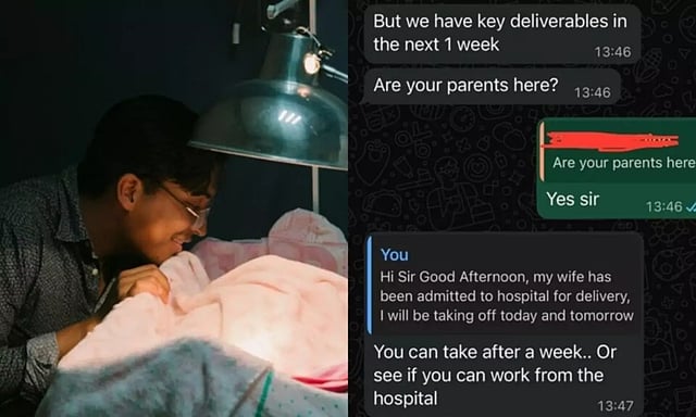 அந்த வகையில், பிரசவ வலி ஏற்பட்ட மனைவியை மருத்துவமனையில் சேர்த்துவிட்டு, தனக்கு 2 நாட்கள் லீவ் வேண்டும் என தனது நிறுவன மேலாளரிடம் கேட்ட ஊழியருக்கு கிடைத்த பதில் அனைவருக்கும் அதிர்ச்சி அளிக்கும் வகையில் அமைந்துள்ளது.