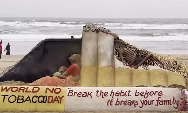 இந்நிலையில், இன்று உலக புகையிலை எதிர்ப்பு தினத்தையொட்டி, பத்மஸ்ரீ விருது பெற்ற மணல் சிற்பக் கலைஞர் சுதர்சன் பட்நாயக், ஒடிசாவின் பூரி கடற்கரையில் பிரமாண்டமான விழிப்புணர்வு மணல் சிற்பத்தை உருவாக்கினார்.