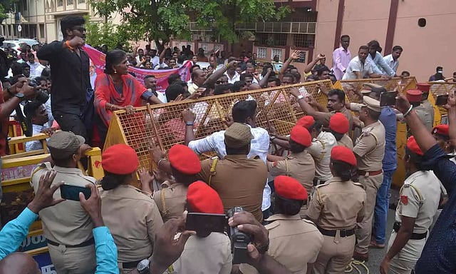 இதனால் ஒருபுறம் போலீசாரும், மறுபுறும் போராட்டக்குழுவினரும் பேரிகார்டுகளை தள்ளிய தால் பரபரப்பு, பதட்டம், வாக்குவாதம் ஏற்பட்டது.