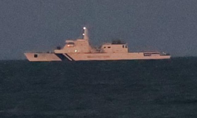 அவர்கள் புதுச்சேரி காந்திசிலை பகுதியில் சுமார் 5 நாட்டிக்கல் மைல் தொலைவில் ரோந்து கப்பலை நிறுத்தி கண்காணிப்பு பணியில் ஈடுபட்டனர். கடற்கரைக்கு வந்த சுற்றுலா பயணிகள், பொதுமக்கள் அதனை செல்போனில் படம் எடுத்து வியந்தனர்.