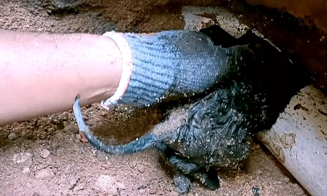 குழாயின் வழியாக கொஞ்சம் கொஞ்சமாக நகர்ந்த நாய்க்குட்டி கழிவறையின் உள்பகுதிக்குள் மாட்டி கொண்டது. அங்கிருந்து வெளியே வர முடியாமல் தவித்தது.