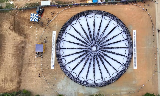 இதில் அக்கல்லூரியை சேர்ந்த மாணவ-மாணவிகள் 4,500 பேர் பங்கேற்று தேசிய கொடியில் உள்ள அசோக சக்கரத்தை உருவாக்கினர். இது உலக சாதனை புத்தகத்தில் இடம்பெற்றது.