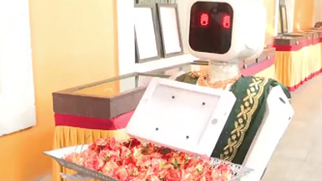 சாவடிக்குள் நுழையும் வாக்காளர்களை பெண் வேடமிட்ட ரோபோ பூக்கள் கொடுத்து வரவேற்றது. இந்த வரவேற்பு வாக்காளர்களை கவர்ந்தது.