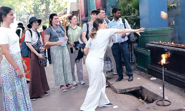 இந்த நிலையில் ஸ்பெயின் நாட்டை சேர்ந்தவர்கள் ஒரு குழுவாக புதுச்சேரிக்கு சுற்றுலா வந்தனர். அவர்கள் அரவிந்தர் ஆசிரமத்துக்கு சென்று தியானம் செய்தனர். பின்னர் மணக்குள விநாயகர் கோவிலை சுற்றி பார்த்தனர்.