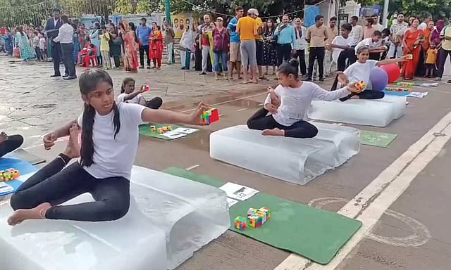 அதன்படி இந்த ஆண்டு உலக சாதனை புரிய வேண்டும் என்பதற்காக ஆணிகள் மீதுப்படுத்தும் பந்துகள் பானைகள் மீது யோகா செய்தும் ஐஸ்கட்டிகள் மீது அமர்ந்து யோகா செய்து மாணவ- மாணவிகள் அசத்தினர்கள்.