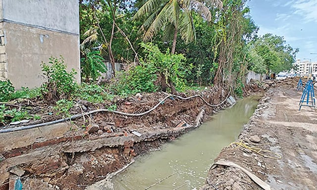 சுமார் 100 மீட்டர் தூரத்துக்கு சுற்றுச்சுவர் இடிந்து தரைமட்டமானது. அந்த இடத்தில் இருந்து சில அடி தூரம் தாண்டி குடியிருப்பு உள்ளதால் பாதிப்பு ஏற்படவில்லை. மேலும் கால்வாய் அமைக்கும் பணியில் அதிக அளவிலான தொழிலாளர்கள் ஈடுபடாததாலும், சுற்றுச்சுவர் அருகே யாரும் இல்லாததாலும் பெரிய அளவில் அசம்பாவிதம் ஏற்படவில்லை. தொடர்ந்து அங்கு கால்வாய் அமைக்கும் பணி நடைபெற்று வருகிறது.