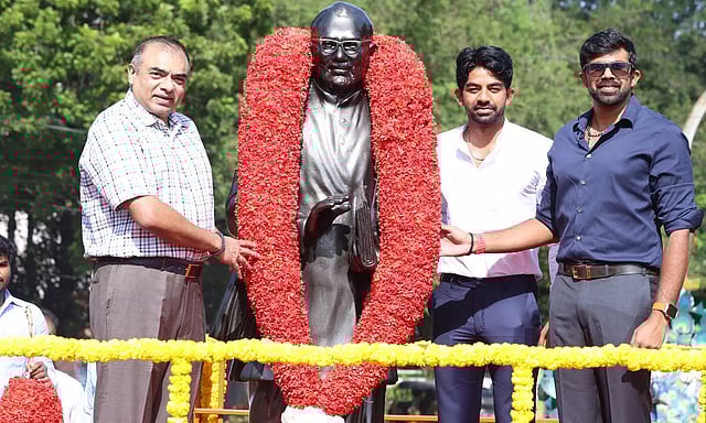 சிலை முன்பு அவரது உருவப்படம் மலர்களால் அலங்காரம் செய்து வைக்கப்பட்டு இருந்தது.