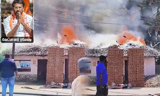 நாகை மாவட்ட பாஜக தலைவர் கார்த்திகேயன் எரிந்த வீடுகளை பார்வையிட வந்த நிலையில், அவரை முற்றுகையிட்டு அப்பகுதி மக்கள் போராட்டம் நடத்தினர்.