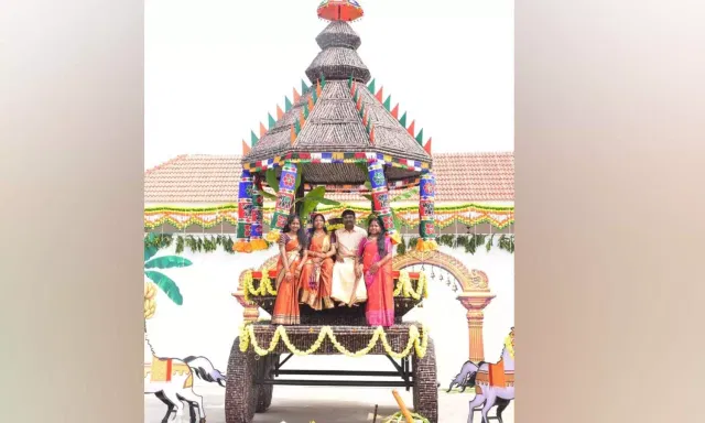இந்த நிலையில் இந்த ஆண்டு பொங்கல் பண்டிகையின்போது அவர் விவசாயிகள் பயிரிட்டு வரும் செங்கரும்பினை அனைவரும் வாங்கி பயன்படுத்த வேண்டும் என்ற விழிப்புணர்வுக்காக 5 டன் செங்கரும்பினால் ஆன பிரம்மாண்டமான திருத்தேரை தயார் செய்து உள்ளார்.