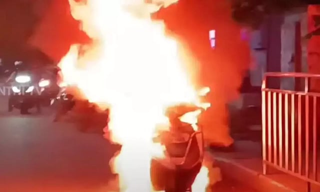 இதைப் பார்த்த பைக்கை ஓட்டி வந்த நபர் சுதாரித்துக்கொண்டு, உடனடியாக பைக்கை சாலையோரம் நிறுத்திவிட்டு தூரமாக சென்றார். அடுத்த சில நிமிடங்களிலேயே பைக் மளமளவென தீப்பற்றி எரியத் தொடங்கியது.