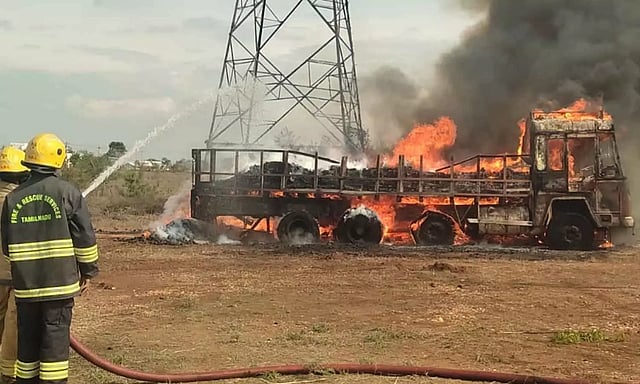 காங்கயம் அடுத்துள்ள சிவியார்பாளையத்தை சேர்ந்தவர் சதாசிவம். தேங்காய் களம் வைத்து நடத்தி வருகிறார். இங்கு உலர்த்தப்பட்ட சுமார் 15 டன் அளவுள்ள தேங்காய் பருப்புகளை மூட்டையில் கட்டி, அதனை எடைபோடுவதற்காக நால்ரோடு பகுதியில் உள்ள எடை மேடை நிலையத்திற்கு லாரியில் கொண்டு சென்றனர். லாரியை ராசிபுரத்தை சேர்ந்த தர்மலிங்கம்(47) ஓட்டிச் சென்றார். காங்கயம் அருகே பரஞ்சேர்வழி சிவியார்பாளையம் சாலையில் தனியார் கிரஷர் அருகில் சென்றபோது தாழ்வாக சென்ற மின்கம்பியில் தேங்காய் பருப்பு லோடு உரசியதாக கூறப்படுகிறது. இதில் மின்கம்பிகள் ஒன்றுடன் ஒன்று உரசியதில் ஏற்பட்ட தீப்பொறி தேங்காய் பருப்பு மூட்டையின் மீது விழுந்து தீப்பற்றிக் கொண்டது. தேங்காய் பருப்பு மூட்டையிலிருந்து புகை வந்ததைக் கண்டவர்கள் உடனடியாக டிரைவரிடம் தெரிவித்தனர்.