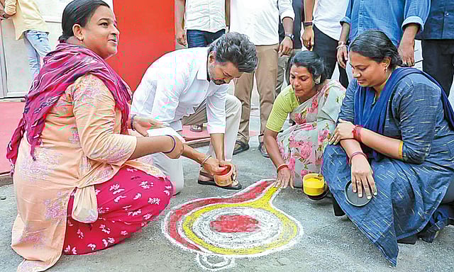 தொடர்ந்து, பணிமனையை சுற்றிப்பார்த்த விஜய், த.வெ.க. பெண் தொண்டர்களுடன் இணைந்து, பணிமனை முன்பு விசில் கோலம் போட்டார். விஜய்யின் வருகையால் அந்த இடம் முழுவதும் மகிழ்ச்சியில் திளைத்தது.