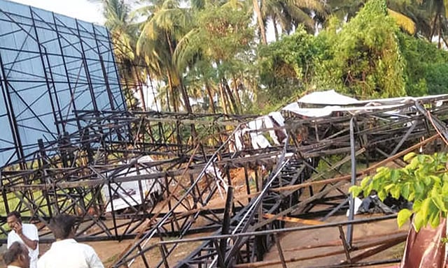 இதனால் இரும்புத்தூண்களின் மேல் நின்று பேனர் மாட்டிக்கொண்டு இருந்த தொழிலாளர்கள் அதிர்ச்சி அடைந்தனர். உடனே அவர்கள் அதில் இருந்து கீழே இறங்க முயன்றதாக தெரிகிறது.