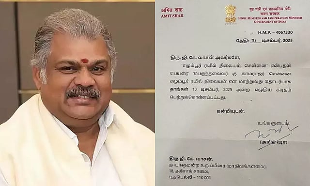 இந்நிலையில், எழும்பூர் ரெயில் நிலையத்திற்கு பெருந்தலைவர் காமராஜர் பெயரை சூட்ட வேண்டும் என கோரிக்கை எழுந்து வருகிறது. அந்த வகையில், தமிழ் மாநில காங்கிரஸ் கட்சியின் தலைவரும், பாராளுமன்ற உறுப்பினருமான ஜி.கே.வாசன், எழும்பூர் ரெயில் நிலையத்திற்கு பெருந்தலைவர் காமராஜர் பெயரை சூட்ட வேண்டும் என உள்துறை அமைச்சர் அமித் ஷாவுக்கு கடிதம் எழுதி இருந்தார். இதனையடுத்து, ஜி.கே.வாசன் எழுதிய கடிதத்தை பெற்றுக்கொண்டதாக உள்துறை அமைச்சர் அமித் ஷா பதில் கொடுத்துள்ளார்.