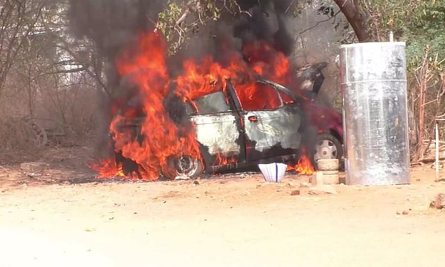 இன்று காலை வேலைக்கு செல்வதற்காக காரை ஸ்டார்ட் செய்ய முயன்ற போது திடீரென காரின் முன் பகுதியில் இருந்து தீப்பற்றி எரிய ஆரம்பித்தது. இதனால் அதிர்ச்சி அடைந்த அவர் காரில் இருந் இறங்கி அக்கம் பக்கத்தினர் உதவியுடன் மண்ணை கொட்டி தீயை அணைக்க முயன்றார்.