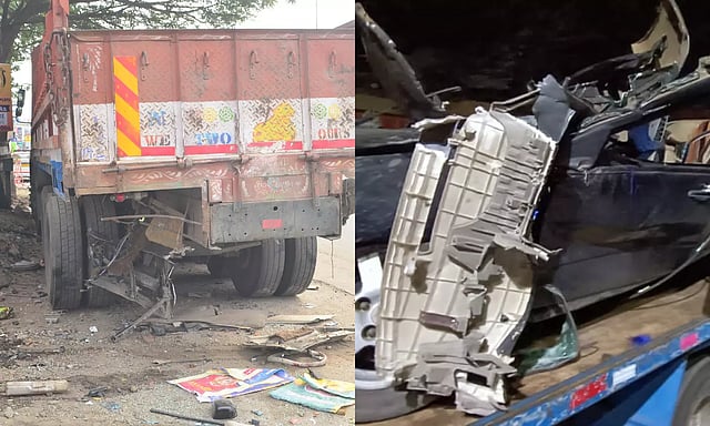 பாலத்தில் இருந்து இறங்கிய கார், திடீரென கட்டுப்பாட்டை இழந்து, சாலையோரம் நின்ற லாரியின் பின்பகுதியில் பயங்கரமாக மோதியது. மோதிய வேகத்தில் கார் லாரியின் அடியில் சிக்கி கொண்டது. இதில் கார் முழுவதும் அப்பளம் போல் நொறுங்கியது.
