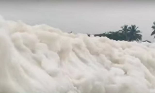 ரசாயன நுரையுடன் பாய்ந்து செல்லும் வெள்ளம் தரைப்பாலத்தை மூழ்கடித்தது. தரைப்பாலத்தில் பல அடி உயரத்திற்கு நுரை காணப்படுவதால் போக்குவரத்து துண்டிக்கப்பட்டுள்ளது.