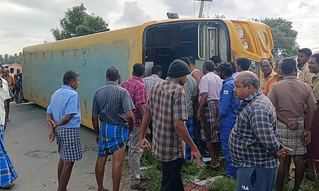 இந்நிலையில் இன்று காலை திருப்பூரில் இருந்து வழக்கம் போல் கல்லூரி பஸ்சில் மாணவ-மாணவிகள் ஏறி கல்லூரிக்கு வந்து கொண்டிருந்தனர். அப்போது பெருந்துறை அடுத்த விஜயமங்கலம் அருகே உள்ள மேட்டுப்புதூரில் பஸ் வந்து கொண்டிருந்தபோது திடீரென டிரைவர் கட்டுப்பாட்டை இழந்து பஸ் சாலையோரம் கவிழ்ந்தது.