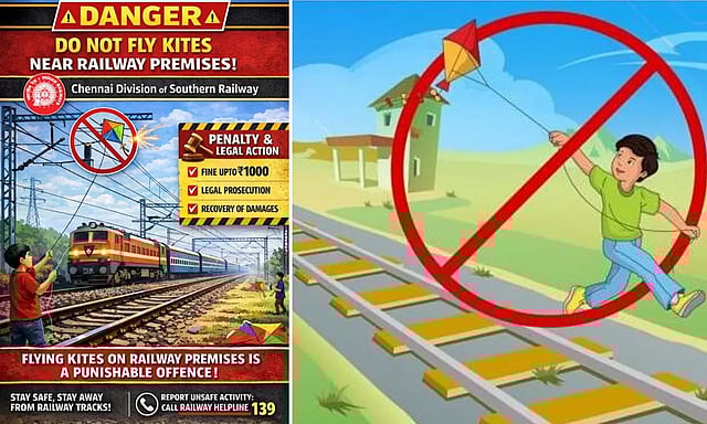 தண்டவாளம் அருகே பட்டம் விடுபவர்களுக்கு 6 மாதம் சிறை அல்லது ரூ.1000 விதிக்கப்படும்" என எச்சரிக்கை விடுத்துள்ளது.