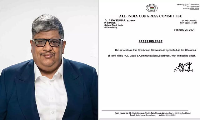 தமிழ்நாடு காங்கிரஸ் கமிட்டியின் ஊடகம் மற்றும் தகவல் தொடர்பு துறை தலைவராக பொருளாதார நிபுணர் ஆனந்த் சீனிவாசன் நியமிக்கப்பட்டுள்ளார் என தமிழக காங்கிரஸ் மேலிட பொறுப்பாளர் அஜோய் குமார் அறிவித்துள்ளார்.