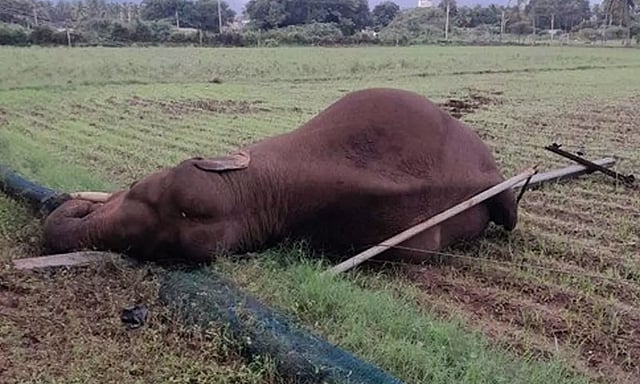 வயலில் அமைக்கப்பட்டு இருந்த மின்கம்பியை சாய்த்தபோது அந்த மின்சார கம்பம் யானையின் மீது விழுந்துள்ளது. அப்போது மின்சாரம் தாக்கி அந்த யானை உயிரிழந்துள்ளது.