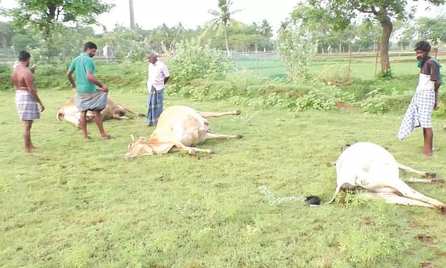 அந்த பகுதியில் சம்பா ஒருபோக நடவு பயிருக்காக நாற்றங்கால்கள் உளவு ஒட்டி உள்ளனர். மேலும் அந்த பகுதியில் தற்போது விவசாயப் பணிகள் தொடங்கி உள்ள நிலையில் விவசாயிகள் சென்று வரும் வருகின்றனர். அதிர்ஷ்ட வசமாக இந்த மின்கம்பி அருந்து விழுந்ததில் விவசாயிகள் எந்தவித அசம்பாவிதமும் இல்லாமல் தப்பி உள்ளனர். இறந்து போன கறவை மாடு தலா 75 ஆயிரம் மதிப்பு இருக்கும் என கூறப்படுகிறது.