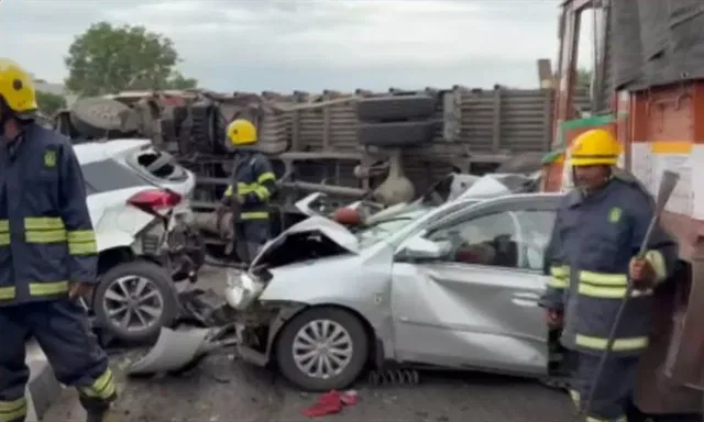 பத்திற்கும் மேற்பட்ட வாகனங்கள் அடுத்தடுத்த மோதி விபத்துக்குள்ளானதில் 5 பேர் படுகாயம் அடைந்துள்ளனர்.
