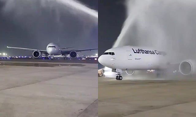 #WATCH | Lufthansa Cargo's inaugural Freighter LH8374 received a grand water canon salute at Chennai Airport as a mark of ceremonial gesture, yesterday (27 October 2024), Lufthansa Cargo will be operating two freighters in a week into and from Chennai directly into Europe.… pic.twitter.com/HUeuNvgdsL