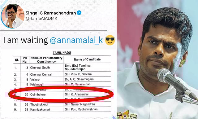 இந்நிலையில், கோவையில் தனக்கு போட்டியாக அறிவிக்கப்பட்டுள்ள பாஜக வேட்பாளர் அண்ணாமலையை, 'IAM WAITING' என எக்ஸ் தளத்தில் குறிப்பிட்டு அதிமுக வேட்பாளர் சிங்கை G ராமச்சந்திரன் வரவேற்றுள்ளார்.
