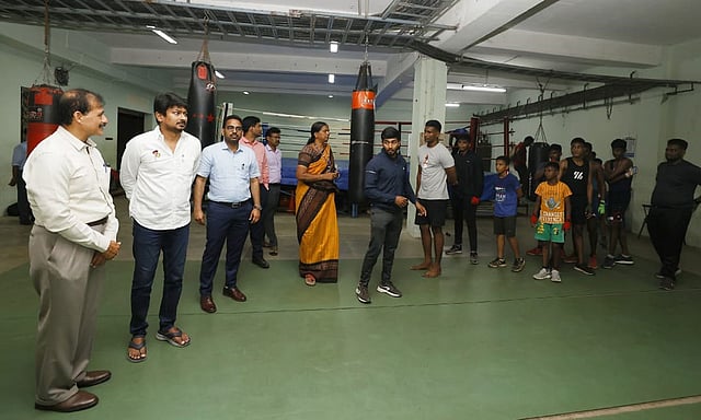 நேரு விளையாட்டு அரங்கில் உள்ள குத்துச் சண்டை அரங்கினை பார்வையிட்டு மாணவர்களுடன் கலந்துரையாடி கூடுதல் வசதிகள் மற்றும் உபகரணங்கள் தேவை குறித்து கேட்டறிந்தார்.