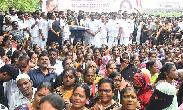 எழும்பூர் ராஜரத்தினம் விளையாட்டு அரங்கம் அருகே நடைபெற்ற இந்த கண்டன ஆர்ப்பாட்டத்திற்கு முன்னாள் அமைச்சர் டி.ஜெயக்குமார் தலைமை தாங்கினார். ஒருங்கிணைந்த சென்னை மாவட்ட செயலாளர்கள் பாலகங்கா, வி.என். ரவி, ஆதிராஜாராம், வி.எஸ்.பாபு, தி.நகர் சத்தியா, ராஜேஷ், அசோக், கே.பி.கந்தன் முன்னிலை வகித்தனர்.