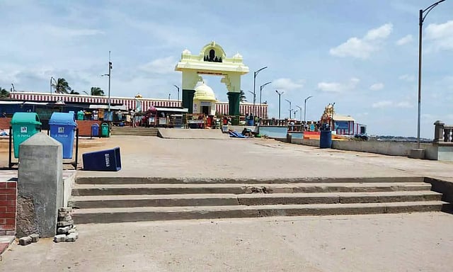 முக்கடலும் சங்கமிக்கும் திரிவேணி சங்கமம் சங்கிலித்துறைகடற்கரை பகுதி சுற்றுலா பயணிகள் இன்றி வெறிச்சோடி கிடப்பதை படத்தில் காணலாம்.***கன்னியாகுமரி, ஜூன்.12-
