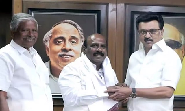 இந்த நிலையில் மனோஜ் பாண்டியன் எம்.எல்.ஏ. இன்று காலை அண்ணா அறிவாலயம் சென்று முதல்-அமைச்சர் மு.க. ஸ்டாலினை சந்தித்து தி.மு.க.வில் சேர்ந்தார். அவருக்கு சால்வை அணிவித்து முதல்- அமைச்சர் மு.க.ஸ்டாலின் வாழ்த்து தெரிவித்தார்.