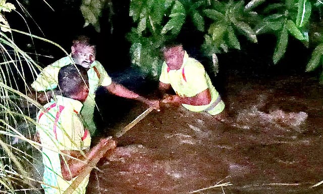 ஆனால் அதிக நீர்வரத்து காரணமாகவும், போதையில் இருந்ததாலும் நிலை தடுமாறி தண்ணீரில் விழுந்து சிக்கிக் கொண்டனர். இதில் மோட்டார் சைக்கிளை ஓட்டி வந்தவர் சுதாரித்துக் கொண்டு நீந்தி கரையேறினார். மற்ற இருவரும் வெள்ளத்தில் சிக்கிக் கொண்டனர்.