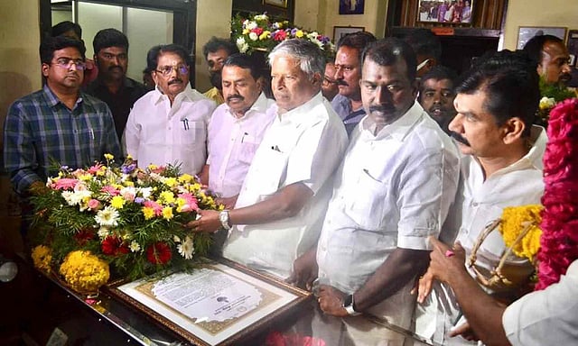 தமிழறிஞரும் பேச்சாளருமான தமிழ்க்கடல் நெல்லை கண்ணன் இன்று காலமானார். அன்னாரது உடலுக்கு முதலமைச்சர் மு.க.ஸ்டாலின் உத்தரவின்படி, மாண்புமிகு வருவாய் மற்றும் போரிடர் மேலாண்மைத்துறை அமைச்சர் கே.கே.எஸ்.எஸ்.ஆர். இராமச்சந்திரன், பிற்படுத்தப்பட்டோர் நலத்துறை அமைச்சர் ராஜகண்ணப்பன் ஆகியோர் நெல்லை கண்ணன் உடலுக்கு மலர் வளையம் வைத்து அஞ்சலி செலுத்தினர்.