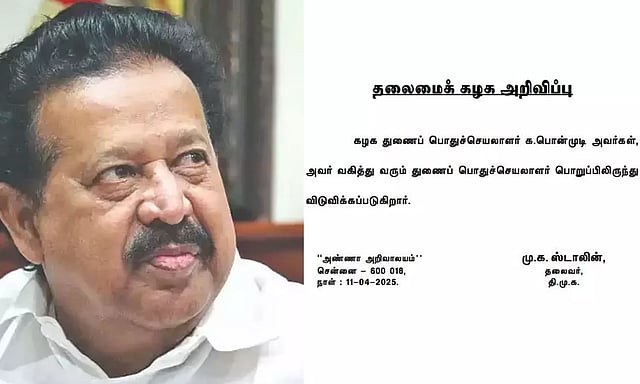 இந்த நிலையில், தி.மு.க.வில் அமைச்சர் பொன்முடி வகித்து வரும் பதவி பறிக்கப்பட்டுள்ளது. இதுதொடர்பாக தி.மு.க. தலைவர் மு.க.ஸ்டாலின் வெளியிட்டுள்ள அறிக்கையில், பொன்முடி வகித்து வரும் துணைப்பொதுச்செயலாளர் பொறுப்பிலிருந்து விடுவிக்கப்படுகிறார் என தெரிவிக்கப்பட்டுள்ளது.