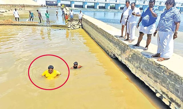 இதனை தொடர்ந்து அதிகாரிகள் காவிரி ஆற்றில் ஜே.சி.பி. எந்திரம் மற்றும் மணல் மூட்டைகளுடன் பணியில் ஈடுபட்டனர். இந்த வேளையில் அங்கு சென்ற பழனியாண்டி எம்.எல்.ஏ. யாரும் எதிர்பாராத வகையில் திடீரென்று ஆற்றுக்குள் இறங்கினார்.