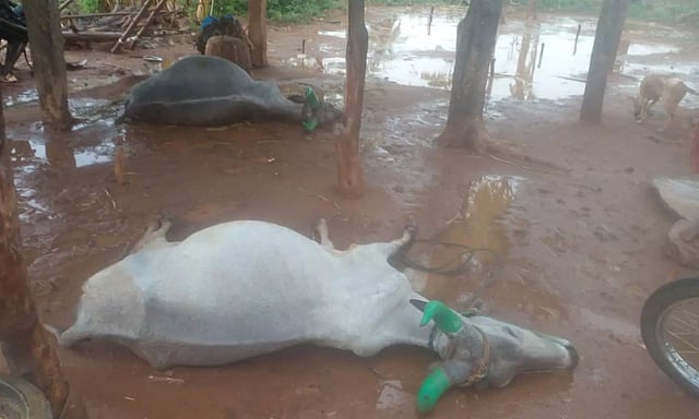 சம்பவம் இடத்திற்கு பூனாச்சி கிராம நிர்வாக அலுவலர் விரைந்து சென்று இருந்த மாடுகள் குறித்து விசாரணை நடத்தினார். இறந்த மாடுகளின் மதிப்பு ரூ.1 லட்சம் இருக்கும் என விவசாயி முருகேசன் வேதனையுடன் கூறினார். மேலும் நஷ்ட ஈடு வழங்கவும் கோரிக்கை எடுத்துள்ளார். இதேபோல் மாவட்டத்தின் ஒரு சில இடங்களில் லேசான மழை பெய்தது.