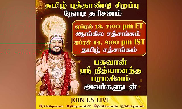 இந்த நிலையில் நாளை தமிழ்ப் புத்தாண்டையொட்டி நித்யானந்தா இன்று இரவு 7 மணி அளவில் ஆங்கிலத்திலும், நாளை இரவு 8 மணி அளவில் தமிழிலும் நேரலையில் தோன்றி பேசுகிறார்.