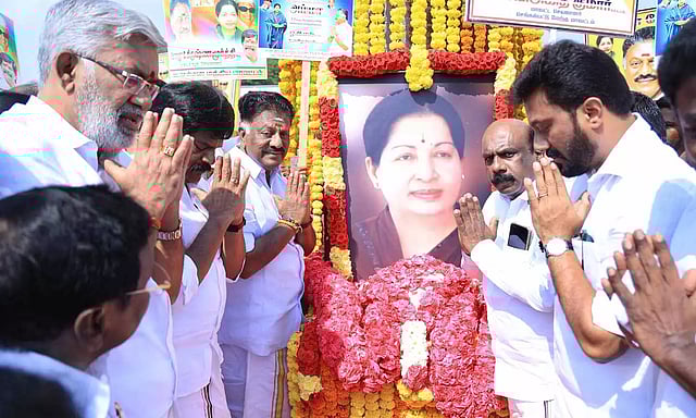 மறைந்த முதலமைச்சர் ஜெயலலிதாவின் 77-வது பிறந்த நாளை முன்னிட்டு சென்னை காமராஜர் சாலையில் உள்ள தமிழ்நாடு உயர்கல்வி மன்ற வாரியம் வளாகத்தில் முன்னாள் முதலமைச்சர் ஓ.பன்னீர்செல்வம், ஜெயலலிதா உருவப்படத்திற்கு மலர் தூவி மரியாதை செலுத்தினார்.