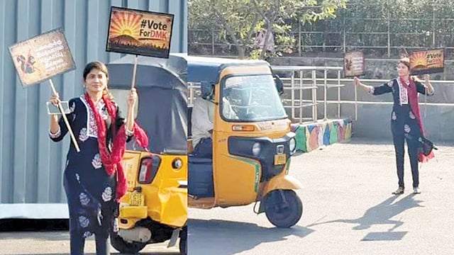 தி.மு.க.வுக்கு ஆதரவாக பிடித்திருந்த பதாகையில் தி.மு.க.வுக்கு வாக்களியுங்கள் என்று குறிப்பிடப்பட்டு இருந்தது. இன்னொரு பதாகையில் அணில் படம் பொறிக்கப்பட்டு அதன் மீது எக்ஸ் சிம்பல் இடம்பெற்று இருந்தது. பெண்களுக்கு இவர்களால் பாதுகாப்பு இல்லை என்று அதில் வாசகம் இடம் பெற்று இருந்தது.