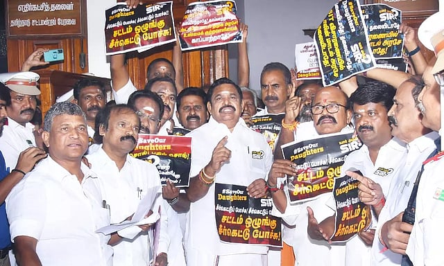 அதற்கு சபாநாயகர் அனுமதிக்கவில்லை. சபாநாயகர் அப்பாவு, அவர்களை இருக்கையில் அமருமாறு திரும்பத் திரும்ப சொன்னார். ஆனால் அ.தி.மு.க. எம்.எல். ஏ.க்கள் இருக்கையில் அமராமல் தொடர்ந்து கோஷம் எழுப்பினார்கள்.