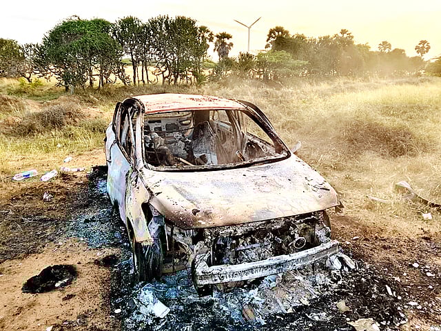 நெல்லை மாவட்டம் திசையன்விளை அருகே உள்ள பெட்டைகுளத்தில் இருந்து கல்லுவிளை செல்லும் சாலையில் பனங்காடு பகுதி இருக்கிறது. இந்த பகுதியில் ஒரு பனைமரத்துக்கு கீழ் இன்று காலை கார் ஒன்று எரிந்து எலும்புக்கூடாக காட்சியளித்த நிலையில் நின்று கொண்டிருந்தது.