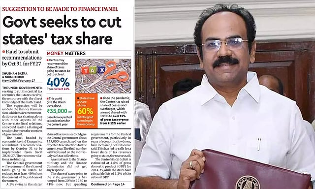 இந்நிலையில், இந்த விவகாரம் தொடர்பாக தனது எக்ஸ் பக்கத்தில் பதிவிட்டுள்ள நிதியமைச்சர் தங்கம் தென்னரசு, ""மாநிலங்களுக்கான நிதி ஒதுக்கீட்டை குறைக்க நிதிக்குழு முடிவெடுத்திருப்பதாக தகவல் வெளியாகின்றன; நிதி ஒதுக்கீட்டை 41%லிருந்து 40%ஆக பரிந்துரைக்க முடிவெடுத்து இருப்பதை ஏற்க முடியாது.