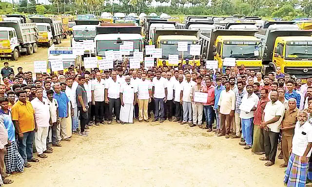 சேலம் மாவட்டம் ஓமலூரிலும் கடந்த 26-ம் தேதி முதல் போராட்டம் நடைபெற்று வருகிறது. இதன் காரணமாக 2 ஆயிரத்து 500 கல் குவாரிகள், 3 ஆயிரம் கிரஷர்கள் இயங்காமல் முடங்கியுள்ளது. இதனால், மாநிலம் முழுவதும் எம்.சாண்ட், ஜல்லி கற்கள் உற்பத்தி பாதிக்கப்பட்டதுடன், கட்டுமான தொழிலும் ஸ்தம்பித்து வருகிறது. தொடர்ந்து ஓமலூர் பகுதியில் நூற்றுக்கும் மேற்பட்ட லாரிகளை ஒரே இடத்தில் நிறுத்தியும், ஆயிரத்திற்கும் மேற்பட்ட உரிமையாளர்கள், தொழிலாளர்கள் ஒரே இடத்தில் அமர்ந்தும் அரசுக்கு தங்களது கோரிக்கையை வலியுறுத்தி வருகின்றனர்.