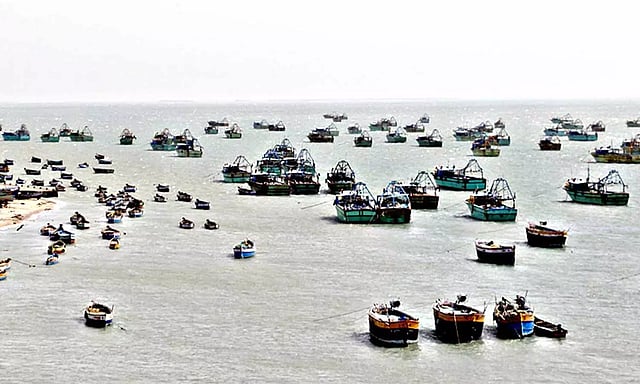 இந்நிலையில் மீன்துறை அதிகாரிகளின் அறிவிப்பை தொடர்ந்து ராமேசுவரம், பாம்பன், மண்டபம், தொண்டி உள்ளிட்ட கடல் பகுதி முழுவதும் சுமார் 10 ஆயிரத்துக்கும் மேற்பட்ட விசைப்படகுகள் மீன் பிடிக்க செல்லாமல் துறைமுக பகுதியில் படகுகளை நங்கூரமிட்டு நிறுத்தி வைக்கப்பட்டிருந்தன.